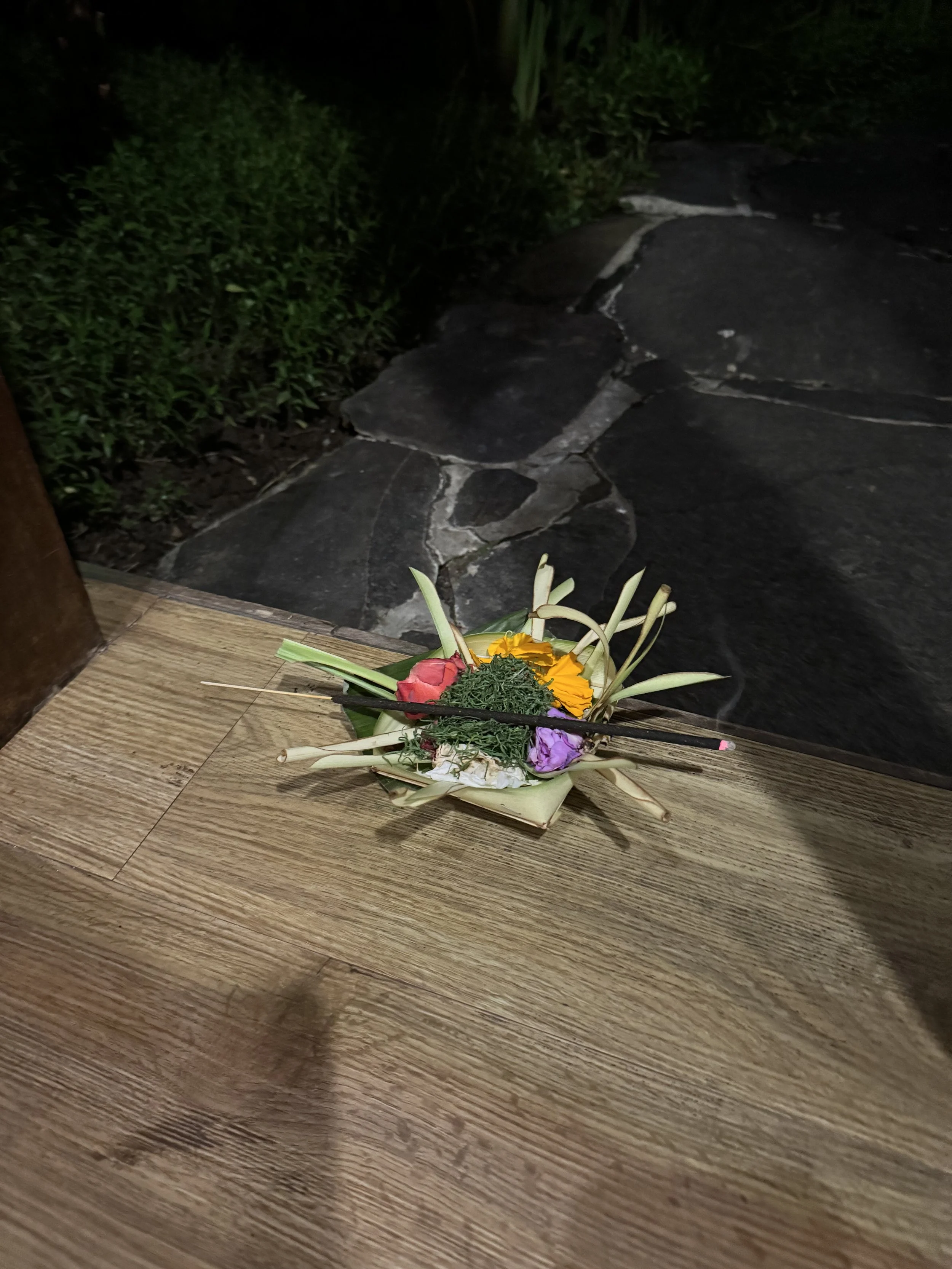 We learned how to make a Balinese offering at our dinner last night. Today in Ubud I picked up incense and lit it about 20 minutes ago. The burning of the incense carries the essence of the offering to the gods. You see these offerings at the entrance to every house and business in Bali. It is has become a very special observation during my time in Bali and I long to find a way to continue some version of it daily. In the last several months a daily mindfulness practice has been in the forefront of my mind. I have been working on gathering my altar items that are both ancestral in nature and meaningful trinkets of loved ones or for loved ones. I wish to incorporate an offering into this practice. It has been a treasure to witness it here and take it in.