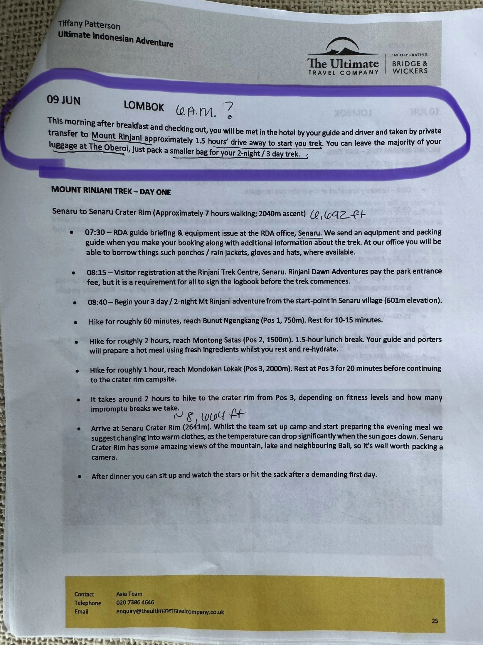 The Itinerary sent to me before leaving the US. NOTE: no detailed packing list for this trek, but going nonetheless and felt confident that I had good hiking shoes, trekking poles, hat and gloves and was sure it would not get “cold” in Indonesia so I was prepared with enough “cold weather” gear - long sleeve shirt, winter running tights, light jacket, rain/wind breaker and rain/wind pants to go over tights, if needed. BUT I WASN’T GOING to need that in Indonesia. The teenage acne on my face was enough to prove that heat and humidity are a constant here.